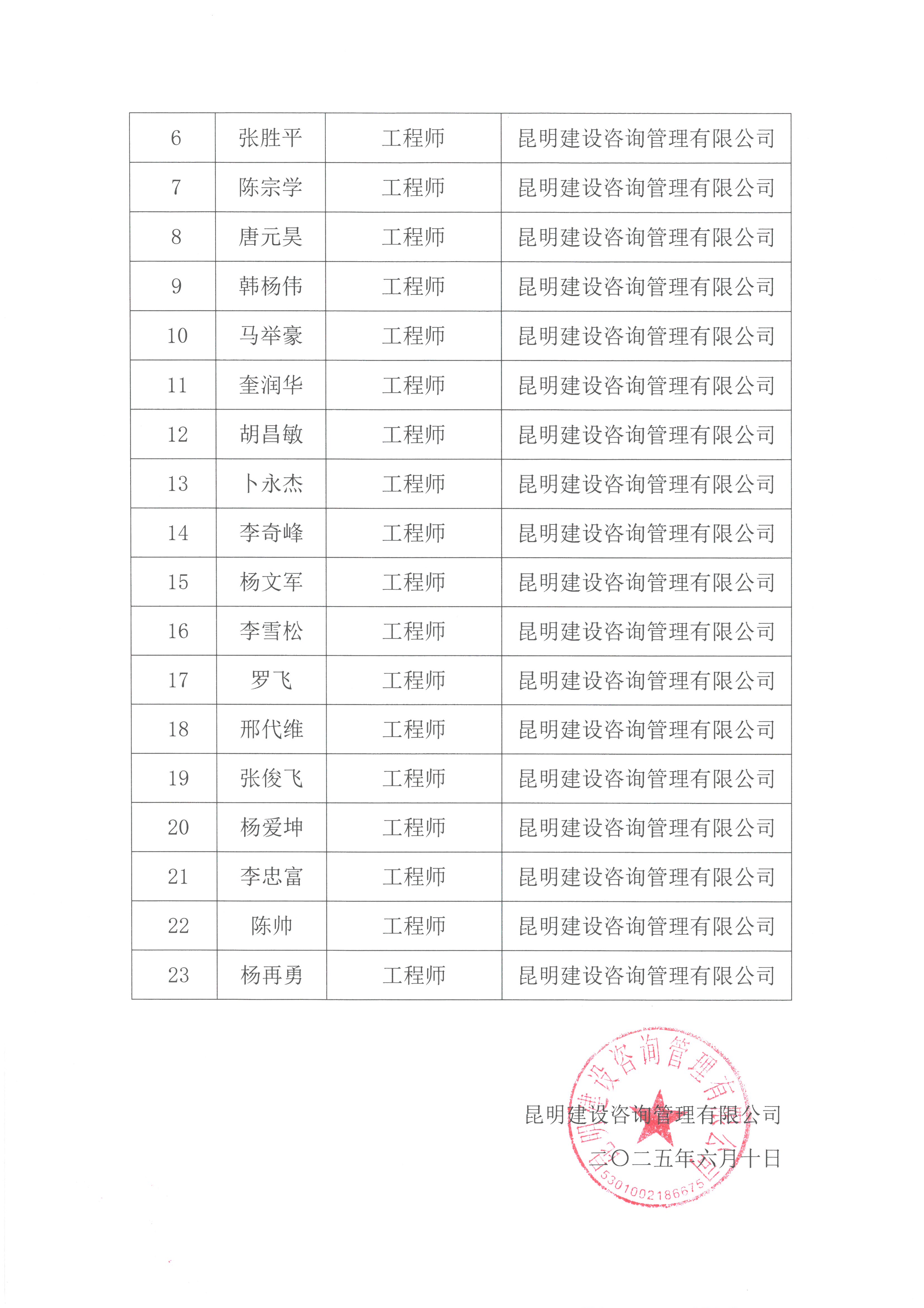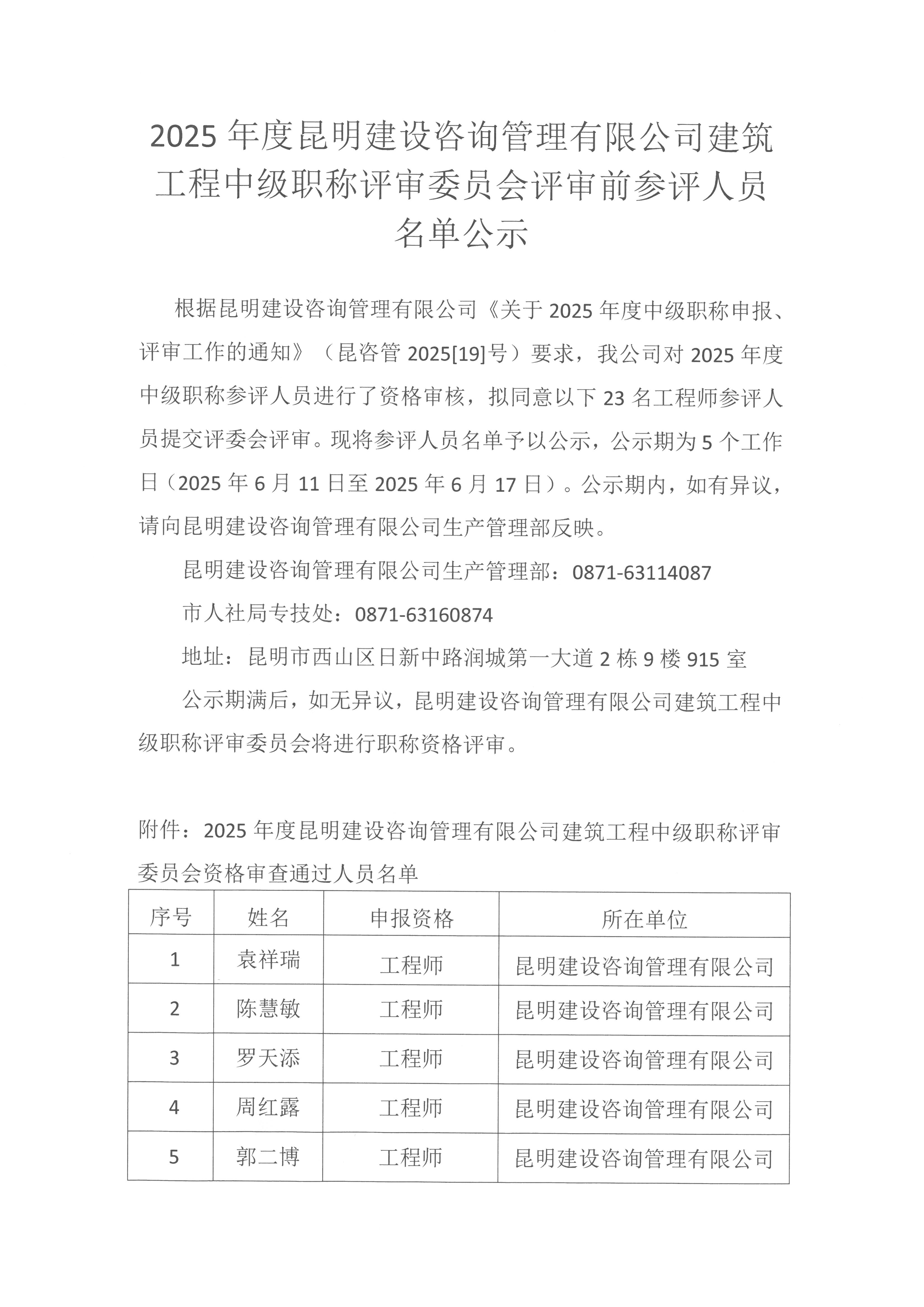 2025年度昆明建设咨询管理有限公司建筑工程中级职称评审委员会评审前参评人员名单公示